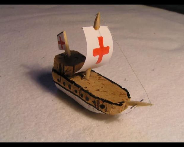 Превращаем наш кусочек пробки в корабль при помощи парусов, флажков, канатов и раскрашиваем.