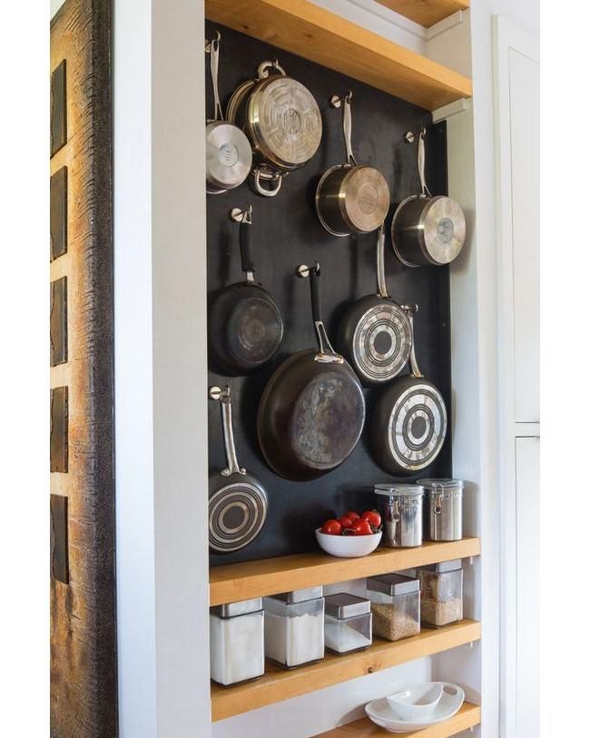 Очень популярен такой вариант, как фанерная доска с мелкими и частыми отверстиями — pegboard. В эти ячейки закрепляются крючки либо штыри, на них можно вешать не только кастрюли, но и половники, ножницы, тёрки, штопоры. Очень удобно — всё под рукой. Не нужно открывать шкаф или выдвигать ящик, чтобы найти необходимый предмет обихода.