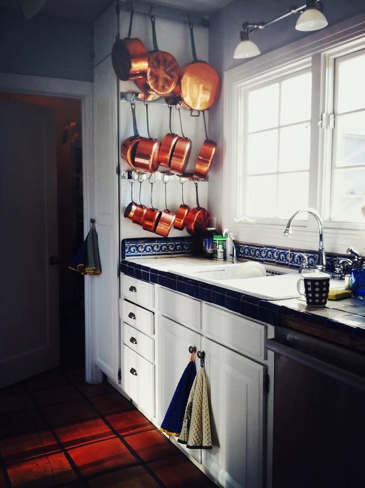 Некоторые кухни настолько малы, что в них едва помещается небольшая тумбочка. Поэтому хозяйкам приходится хранить кухонную утварь в духовке. Чтобы забыть об этом раз и навсегда, повесьте сковородки и кастрюли на стену. Посмотрите, насколько стильно и уютно это выглядит.