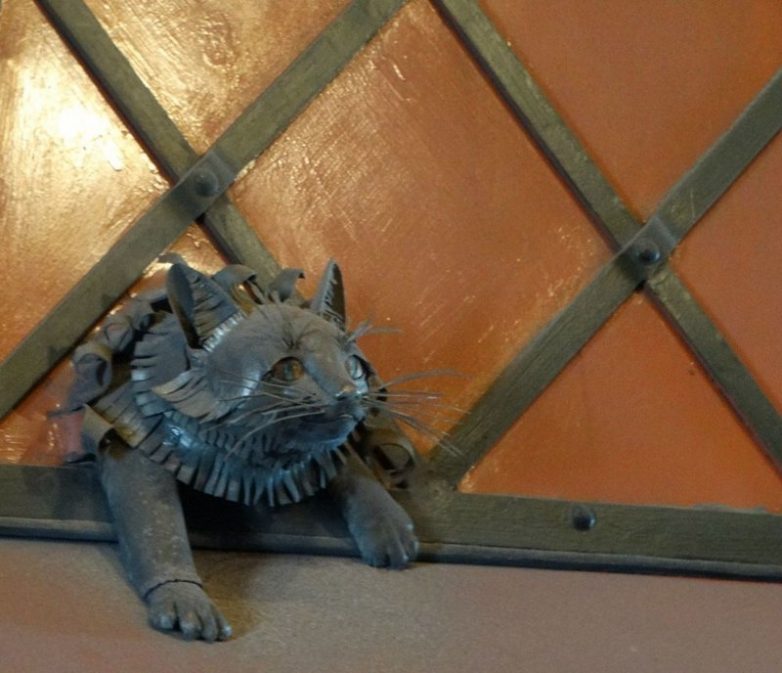 Гибкая кошечка потягивается на окошке в главном зале кузницы
