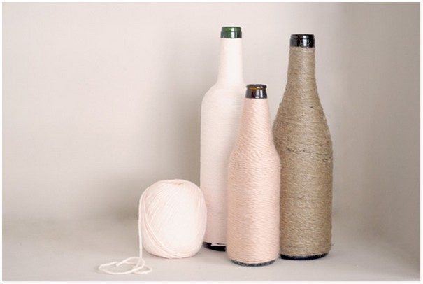 Одна из вещей, которую можно создать из остатков пряжи – красивая ваза для цветочных композиций. Мы уже делали с Вами упакованные веревками бутылки, но пряжа более тонкая и нежная.