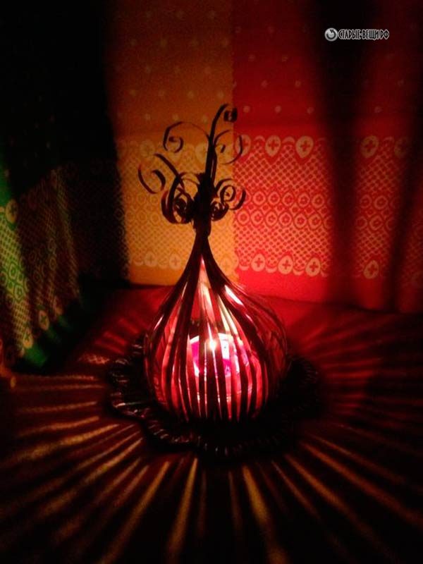 Существуют и другие не менее красивые ажурные подсвечники из обыкновенных пивных банок, авторы которых, к сожалению, мне не известны, но от этого они не теряют своей привлекательности. Это большой труд наших умельцев. Алюминиевые банки- это не бумага, которая используется при изготовлении поделок в стиле квиллинга. Понимаю, что такие потрясающие поделки из алюминиевых банок требуют от мастера большого внимания из-за сложности и трудоемкости работы. Но результат превосходит все ожидания. Кроме того, подсвечники из алюминиевых банок более безопасны при эксплуатации и уж очень эффектны.