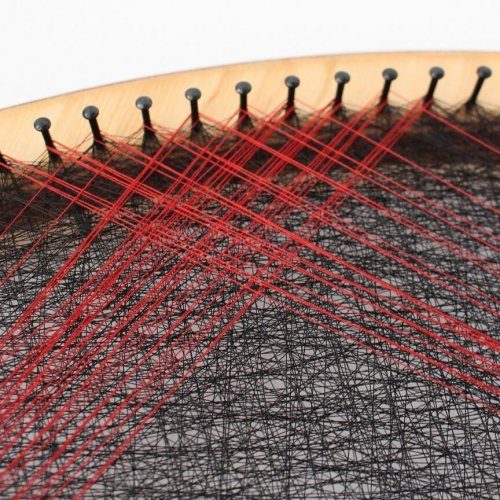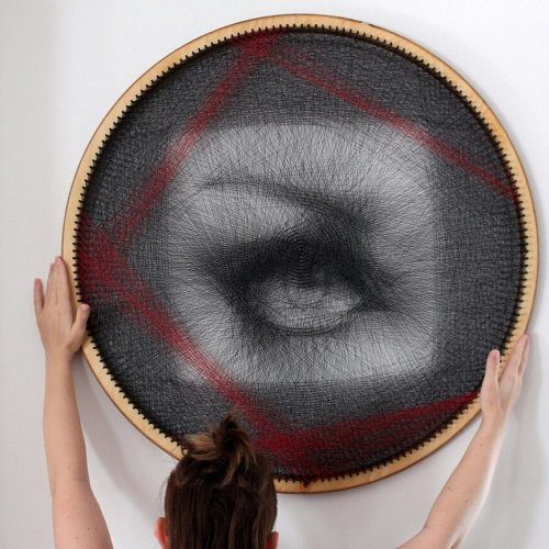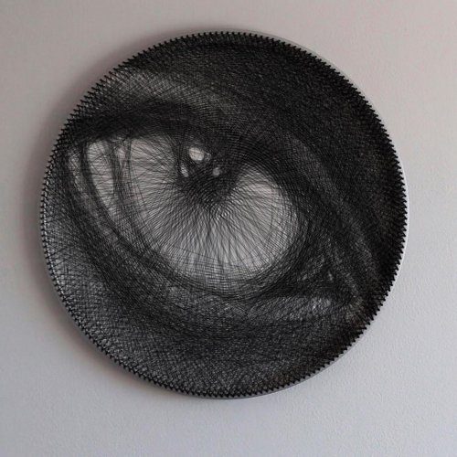 Каждое творение выглядит, как текстильный спирограф, состоящий из бесчисленных линий чёрной нити, переплетённых между собой и плотно намотанных вокруг круглых, глянцевых, алюминиевых и деревянных рамок.