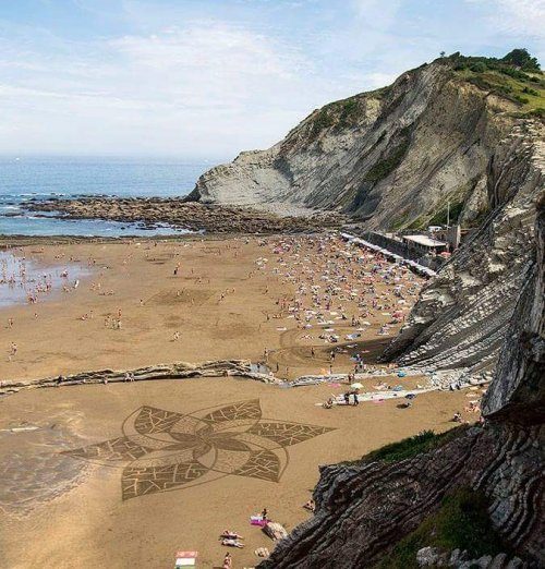 Он рисует на песке монументальные фрески, играя узорами и эффектом трёхмерной перспективы.