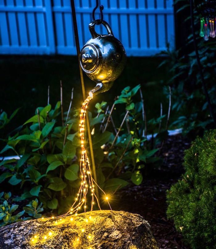 После захода солнца вступает в бой декоративное освещение, которое может до неузнаваемости преобразить приусадебный участок. Освещение можно сделать самостоятельно как со старых чайников или люстр, так и с обычных елочных гирлянд.
