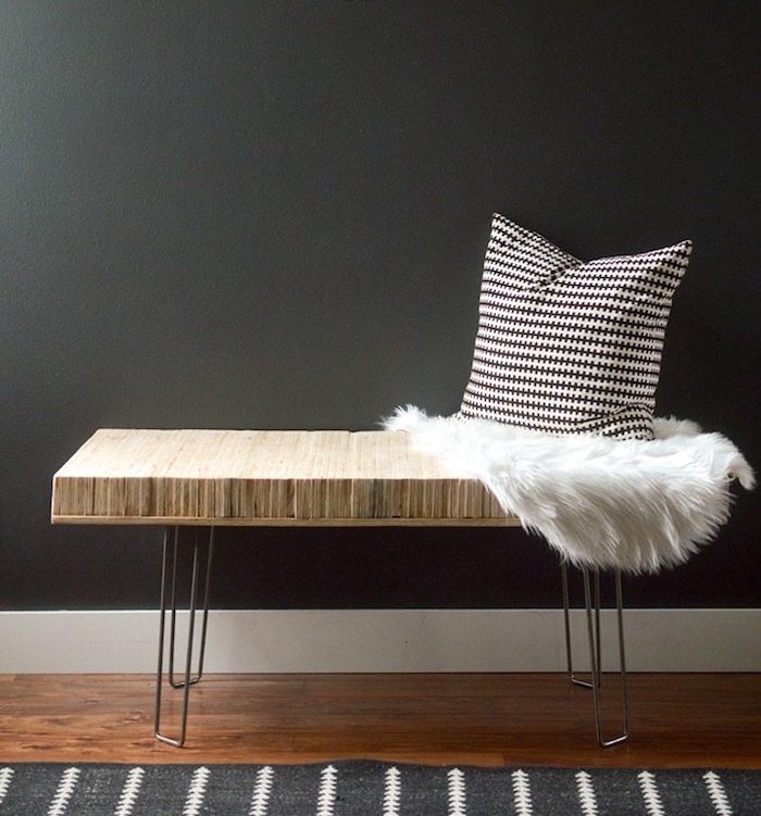 Современная скамья из склеенных вместе кусков фанеры Нам очень нравится этот вариант простой и бюджетной скамьи в прихожую. Основной материал — фанера, которую можно приобрести в строительных магазинах примерно за 10$/лист, где сразу же можно заказать порезку. Одинаковые по размеру куски фанеры склеивают между собой и прикручивают металические ножки.