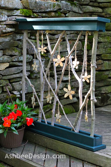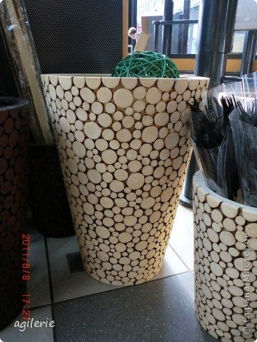 Для любителей эко-стиля в интерьере. Посмотрите, как можно использовать спилы свежих веточек для создания цветов, снежинок и для создания цветочных ваз и кашпо. Вазы ниже сделаны из пластиковых ведерок, они обклеены спилами веток, отшлифованы, покрашены и покрыты лаком.