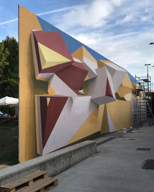 Итальянский художник Мануэль де Рита (Manuel de Rita), также известный как Peeta, преобразует дома и сооружения, рисуя на них красочные кубы и абстрактные цилиндрические формы так, будто они парят перед стеной.