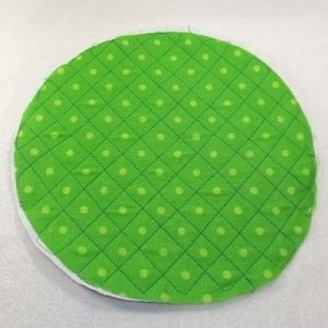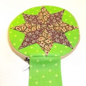 Из ткани, приготовленной для шитья наружной части органайзера, вырезаем круг диаметром 25 см. Выкраиваем детали аппликации из двух видов лоскутов, пришиваем аппликацию на швейной машинке.