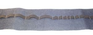 Чтобы превратить нашу шкатулку в органайзер, к полоске джинсовой ткани пришиваем широкую резинку, отмечая различные по размеру отделения.