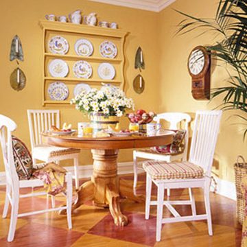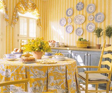 На обоях с мелким пестрым рисунком не советуем размещать пестрые тарелки, особенно те, что не слишком подходят по цветовой гамме. Лучше выбрать однотонные или двухцветные. В последнем случае желательно, чтобы хотя бы один из оттенков “поддерживался” в цвете другого, достаточно крупного предмета интерьера, например, в обивке дивана или скатерти на столе.