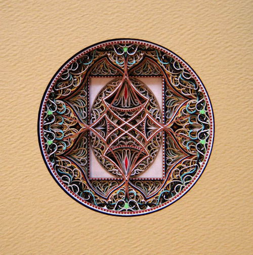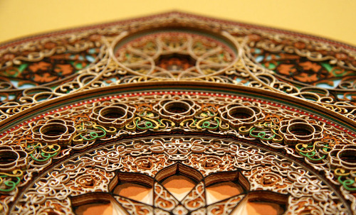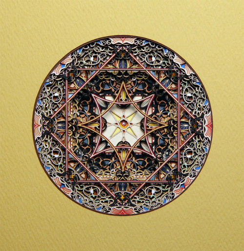 Как он сам пишет, эти узоры вдохновлены готической и средневековой исламской архитектурой. А техника простая и интересная: это сотни слоев цветного картона, которые он режет специальным лазером.