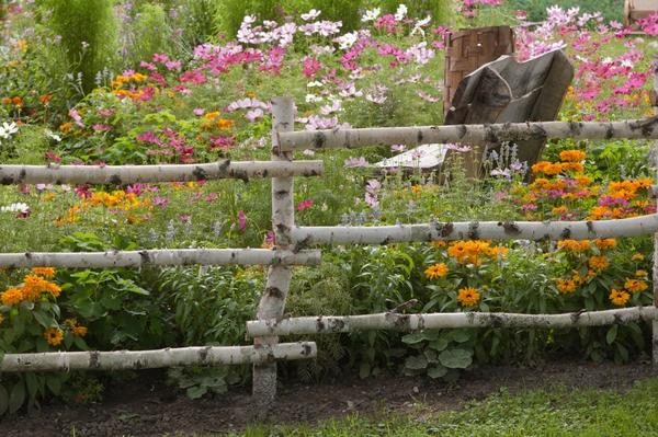 По-деревенскиДля сада-огорода в стиле кантри весьма уместны соответствующие заборы. Они, конечно, ничего не скрывают и ни от кого не защищают, разве что обозначают границы владений. Но зато в соответствующем окружении отлично смотрятся! Для тех, кому жизнь за «крепостной стеной» не по душе, — совсем простой забор из березовых жердей.