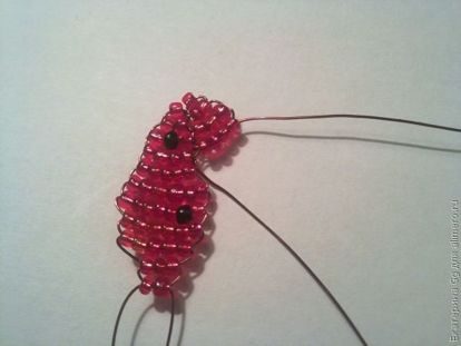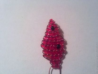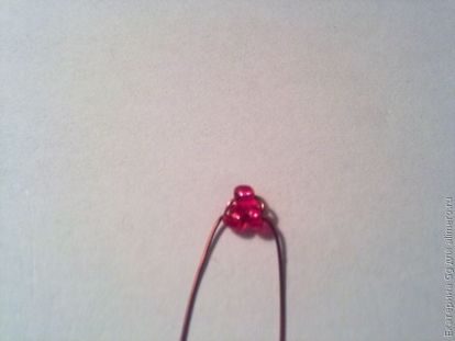 Плетем первую часть, применяем схему параллельного плетения: 1,2,3,4,5,6,7,6,5,3,2 красные бисеринки, и в каждой части среди красных бисеринок вставляем по 2 черные.