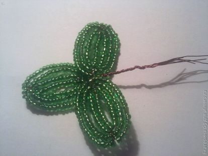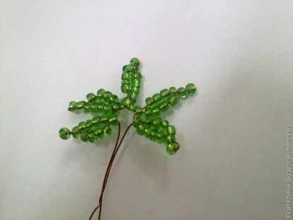 На проволоку набираем 7 зеленых, проходим через 6-ую, набираем еще 4 и проходим через 1-ую. И так рядышком, на расстоянии 0,5 см делаем еще 4 чашелистика.