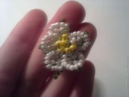 Из белого бисера делаем цветок. Набираем 5 бисеринок, скручиваем, набираем еще бисеринки, чтобы они были вокруг первого нами набранного ряда, и скручиваем.