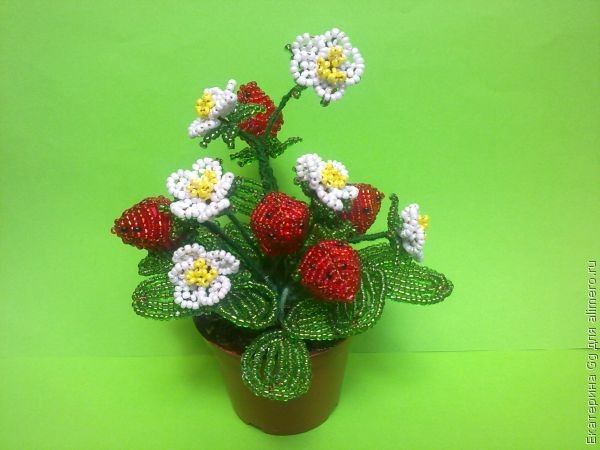 Сегодня я расскажу, как сделать вот такой красивый кустик ягод клубники с белыми цветочками. Всем желаю удачи в плетении!
