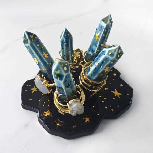 А для придания своим творениям большей таинственности она дополняет их сверкающими кристаллами, также изготовленными из керамики.