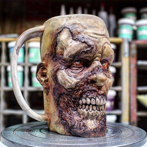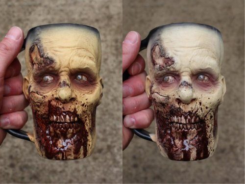Автором этих зомби-чашек является мастер гончарных дел Кевин Мерк (Kevin Merck), более известный как Turkey Merck. Эти жуткие, но функциональные и очень популярные чашки он делает из глины с добавлением элементов из эпоксидной смолы.