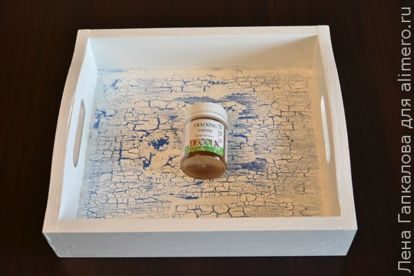 Когда краска полностью высохла, сухой чистой кистью нанесла лак кракелюр на синее дно подноса. Лак наносила в одном направлении однократным проведением кисти. Дала лаку подсохнуть. Покрыла поверх лака дно подноса белой краской. Через некоторое время краска начала подсыхать и растрескиваться. Поднос уже сейчас, на мой взгляд, неплохо выглядит.)