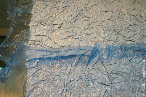 С первого раза красиво не получилось, не беда. Берём небольшой отрезок полиэтиленовой плёнки, примерно с пакет для хлеба, и накладываем его на слой шпаклёвки-краски. Разглаживаем руками по стене. И очень быстро отдираем от стены. Поэкспериментируйте со скоростью отлипа, силой нажатия, смазывающими движениями шпателя для получения лучшего эффекта.