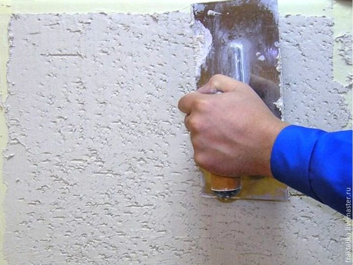 2. Делаем фактуру Ложкой или узким шпателем выкладываем на широкий шпатель шпаклёвку-краску. Наносим лёгкими короткими движением, буквально едва касаясь стены, толстый слой шпаклёвки, примерно 1-1,5 см, и совсем чуть-чуть распределяем по стене, слегка надавливая на шпатель рукой. Инструмент держим почти параллельно стене, и так и ведём, как бы снимая верхний слой. Это движение, без коротких мазков, оставляет красивый пупырчатый след после первого захода.