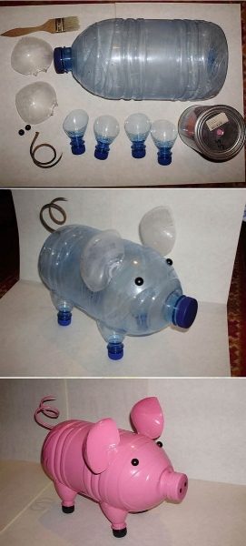 Инструкция по изготовлению поросенка из бутылок своими рукамиПосле того, как поросенок будет готов, останется только покрасить его в розовый цвет. Можно делать несколько разных поделок. Вот вам еще пара фото: