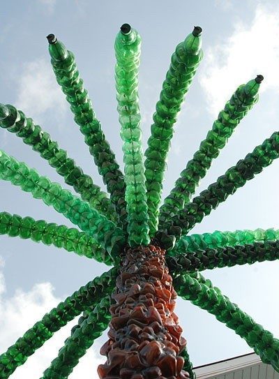 Пальма из пластиковых бутылок инструкция Важно знать, что большинство поделок из пластиковых бутылок, связанных с деревьями, выполняются по аналогичной схеме. В работе понадобятся — пластиковая бутылка, ножницы, краска для пластика и проволока. Выполнение пальмы происходит с использованием средних и нижних участков бутылок темного цвета, листву целесообразно сделать из бутылок зеленого цвета. В пластиковую бутылку со срезанным дном вставляется следующая аналогичная бутылка, пока не будет сформирована необходимая высота. Все элементы нанизываются на проволоку, проходящую сквозь горлышко, на верхушку крепится горлышко зеленой бутылки без дна. Далее равными частями нарезаются полоски из зеленого пластика и наклоняются к низу, имитируя пальмовую листву.
