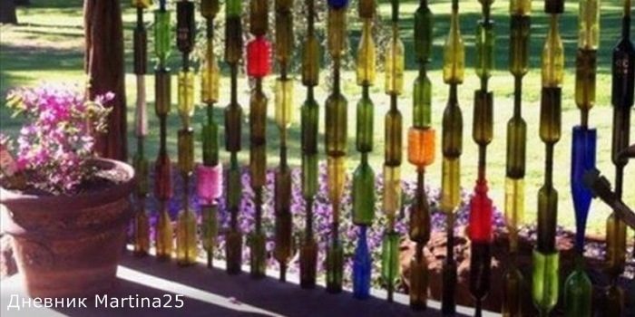 На первом фото шикарная ширма из цветных стеклянных бутылок, если разноцветных бутылок у вас недостаточно, окрасьте обычные прозрачные бутылки красками для витража. Солнечные лучи светят через ширму и озаряют вашу террасу яркими лучами.