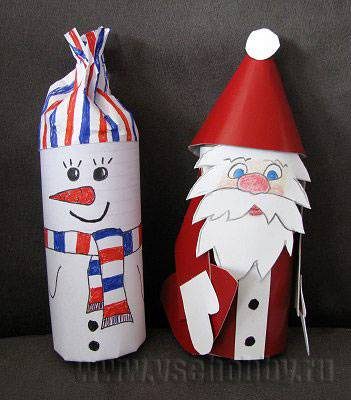 На основе рулончика от туалетной бумаги можно сделать фигурки простых Деда Мороза, снеговика, Снегурочки и прочих новогодних персонажей.