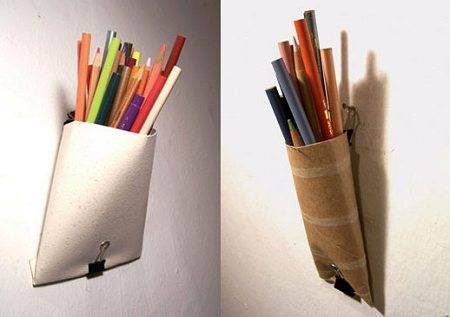Можно сделать и минималистичный и очень быстрый в изготовлении держатель для карандашей, который подвешивается на стену (нужно к картонной трубочке от туалетной бумаге добавить лишь два зажима для бумаг):