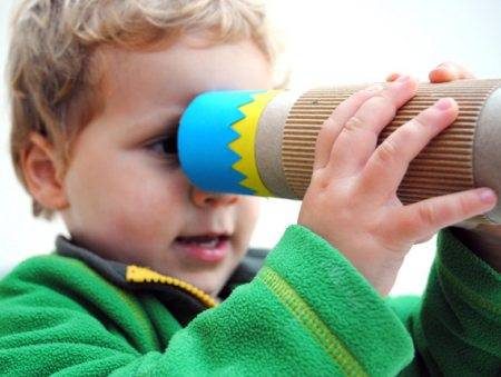 Для подзорной трубы достаточно взять рулончик от полотенец, фольги или плёнки (или склеить несколько — от туалетной бумаги), обклеить цветной бумагой, фольгой, самоклеющейся бумагой, раскрасить.