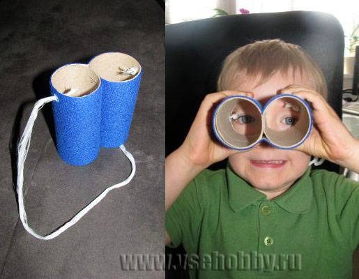 Бинокль проще всего сделать так: два рулончика туалетной бумаги скрепите между собой степлером с обеих сторон, сколов примерно в сантиметре от края, всунув внутрь трубочек степлер. Причём с каждой стороны дважды, меняя направление (чтобы загнутые скобочки смотрели и слева направо и справа налево). Двусторонним скотчем наклейте цветную бумагу снаружи. Шилом проколите дырочки по бокам, если есть возможность, вставьте блочки (айлетсы), вденьте верёвочку, чтобы бинокль можно было носить на шее.