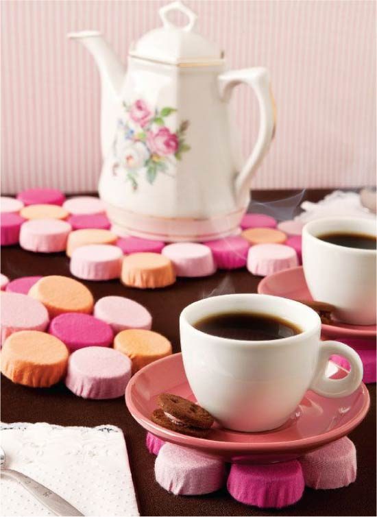 В этой подборке представлены другие идеи подставок под посуду из пластиковых и жестяных крышек.