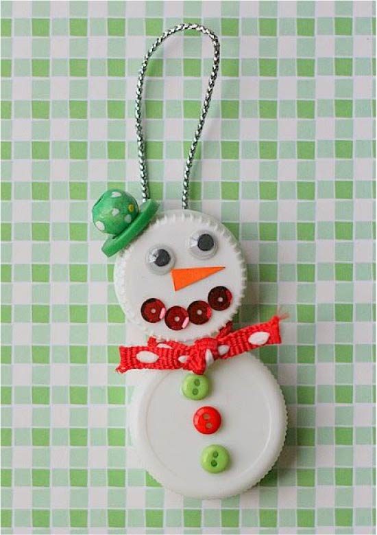 Елочная игрушка-снеговик из пластиковых крышек