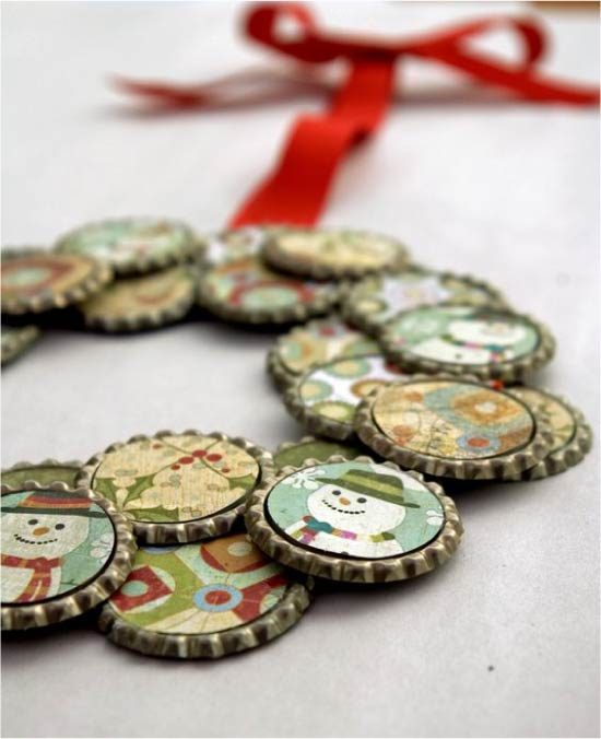 Идея 4. Новогодние поделки (+ мастер-класс)Из жестяных и пластиковых крышек от бутылок получаются красивые новогодние поделки: венки, мини-елки, гирлянды, ярлыки для подарков и, конечно, ёлочные игрушки.