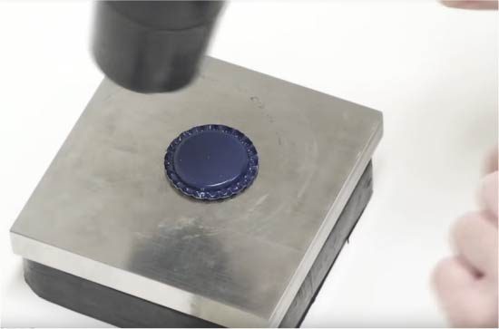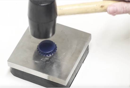 Заметили, что на некоторых фото крышки выглядят немного по-другому – не имеют острой «короны», но имеют углубление внутри? Видоизменить крышки таким образом очень легко при помощи одного лишь резинового молотка и твердой платформы. Положите крышку на платформу лицом вверх, теперь с силой ударьте по центру крышки молотком.