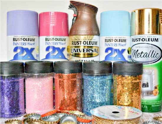 Баллончики с краской пастельных тонов (можно использовать и краску в банках); Золотой шнур или тесьма; Горячий клей-пистолет; Жестяные крышки (лучше всего ровные крышки, но и чуть погнутые тоже подойдут); Блестки.