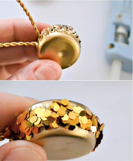 Шаг 2. Как только все пробки высохнут, приступайте к изготовлению первой подвески. Для этого завяжите небольшой отрезок шнура в петлю, затем приклейте ее основание к внутренней стороне крышки и, наконец, сверху приклейте вторую крышку (см. фото). Будьте осторожны и не кладите слишком много клея, чтобы избежать появления его излишков между крышками.