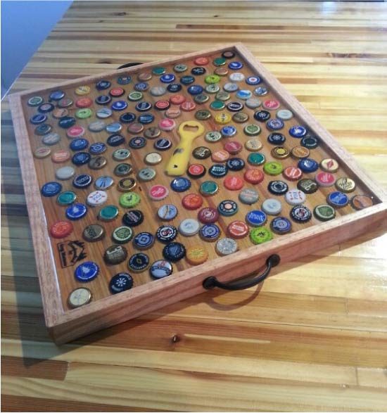 Идея 9. Сервировочный подносУкрасить скучный сервировочный поднос крышками очень просто: аккуратно выложите все пробки на дно, затем залейте их слоем эпоксидной смолы и оставьте поделку сохнуть не менее чем на сутки. Главное здесь – смешать смолу с отвердителем согласно инструкции производителя (с точностью до грамма!) и заливать ее медленно, не допуская образования пузырьков. Если вы хотите, чтобы слой смолы был идеально прозрачным, используйте жидкую эпоксидную смолу для декоративных, а не строительных работ.