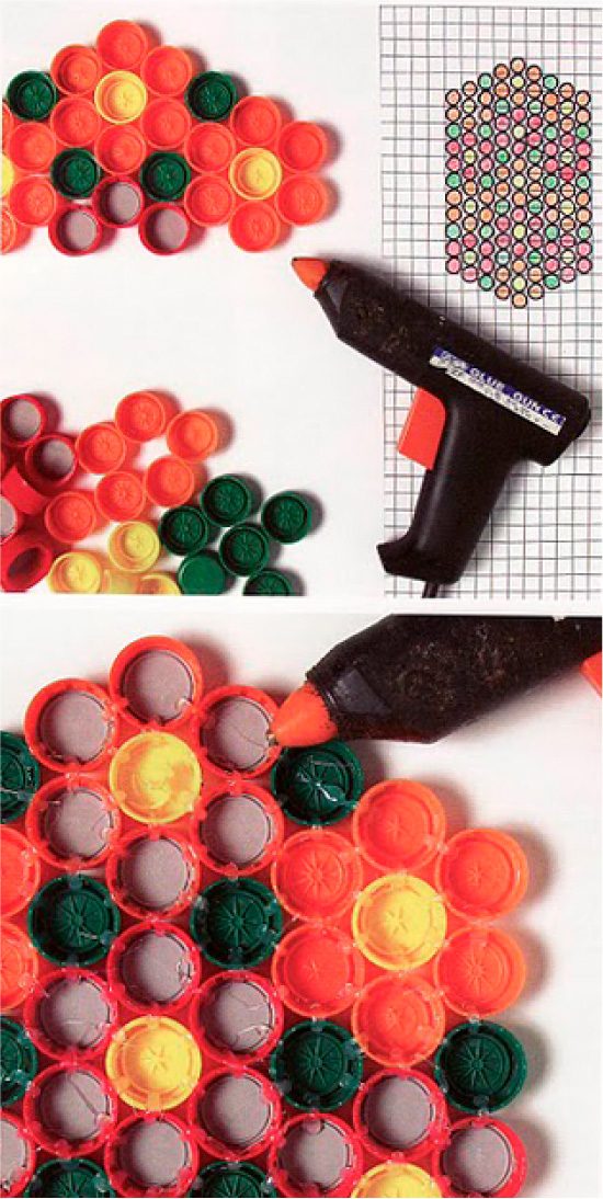 Пластиковые крышки при составлении панно позволяют играть не только с их цветом, но и с размерами, а также комбинациями уложенных друг на друга крышек (см. фото).