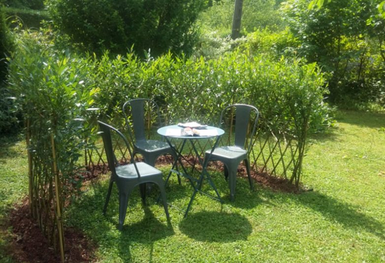 Вот еще одно интересное место для отдыха, декорированное ветками вербы. А представь, какой красоты можно добиться, если пустить по такой перголе вьющиеся растения.
