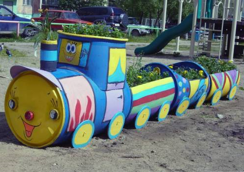 — клумба — паровозик, думаю, что не у многих можно увидеть такое применение бочки. Да и деткам это хорошее развлечение!