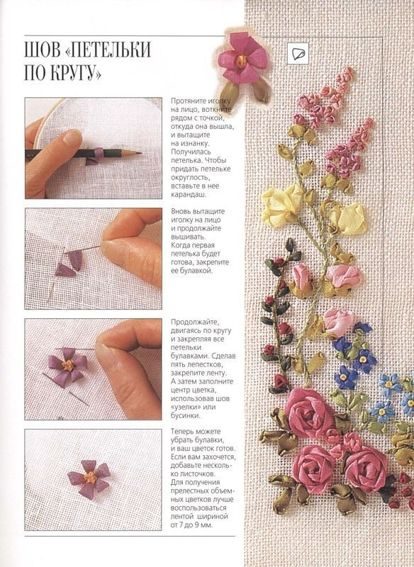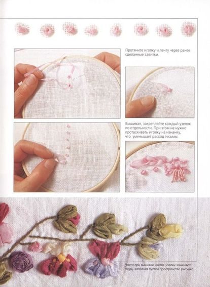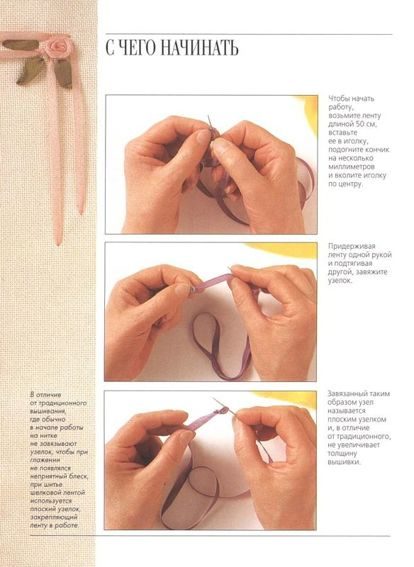 Теперь предлагаю рассмотреть технику вышивания лентами — с чего начинать вышивать, как закреплять шов, какие виды швов существуют и как их выполнить: