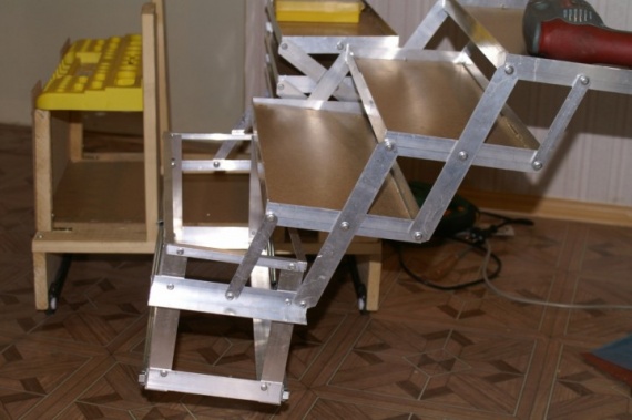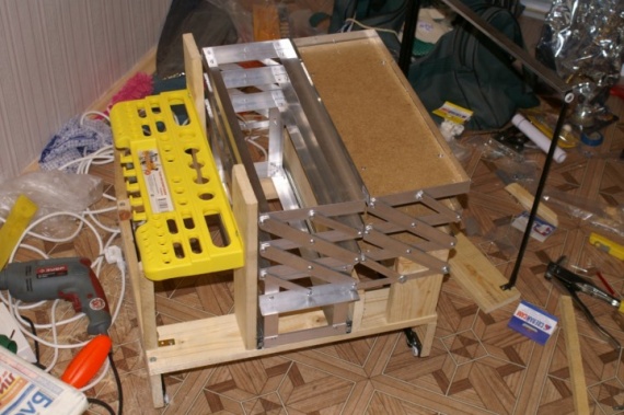 2. Потом из алюминиевого уголка нарезал электролобзиком элементы ящиков, а из алюминиевых полос — полоски для механизма раскладывания ящиков (лягушки). Все алюминиевые детали соединены заклепками (4 х10, может чуть длинее). Детали раскладывающейся «лягушки» заклепаны с шайбами. Порядок такой: заклепка, шайба, полоска, шайба, уголок ящика. Порядок подобран эксперементально, если соединять по другому, заклепки перетираются.