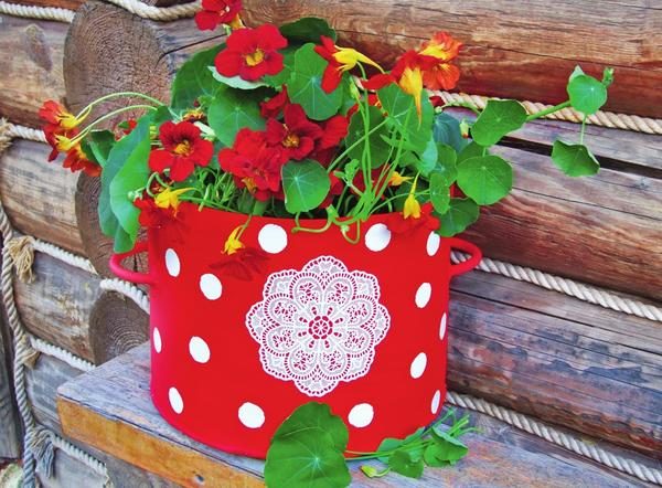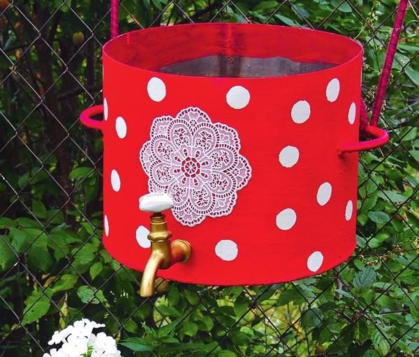 Важно: используйте для этих целей эмалированную посуду (при наличии сколов она не годится для приготовления пищи, но идеально подходит для садового декора). Главное — выбрать удачное оформление: яркое, позитивное и выдержанное в силе общего оформления сада.