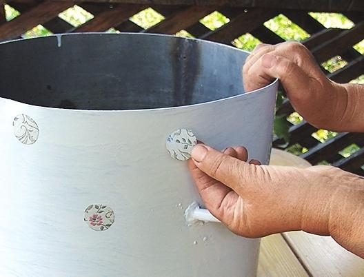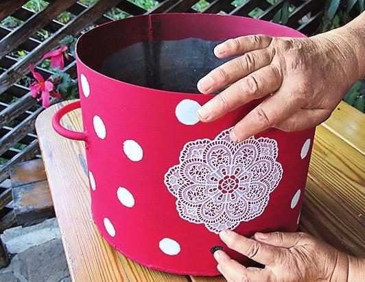 7. Всю поверхность кастрюли, кроме места для кружевного фрагмента, оклейте кружочками, чтобы получился орнамент «в горошек».