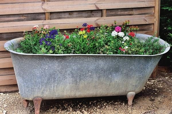 Под цветочную клумбу можно приспособить и другую дачную утварь — например, старую ванну: