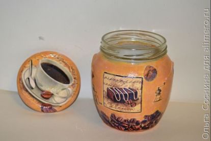 Следующий этап – декупаж. Из декупажной карты вырезала интересующие меня фрагменты. На нижнюю часть банки приклеила полоску с кофе.