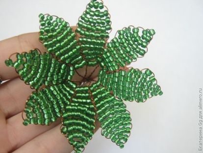 Беру зеленый бисер и делаю чашелистики. 8 штук, соединенных между собой после седьмого ряда. Техника параллельного плетения: 1-3-5-7-7-7-6-5-4-3-3.